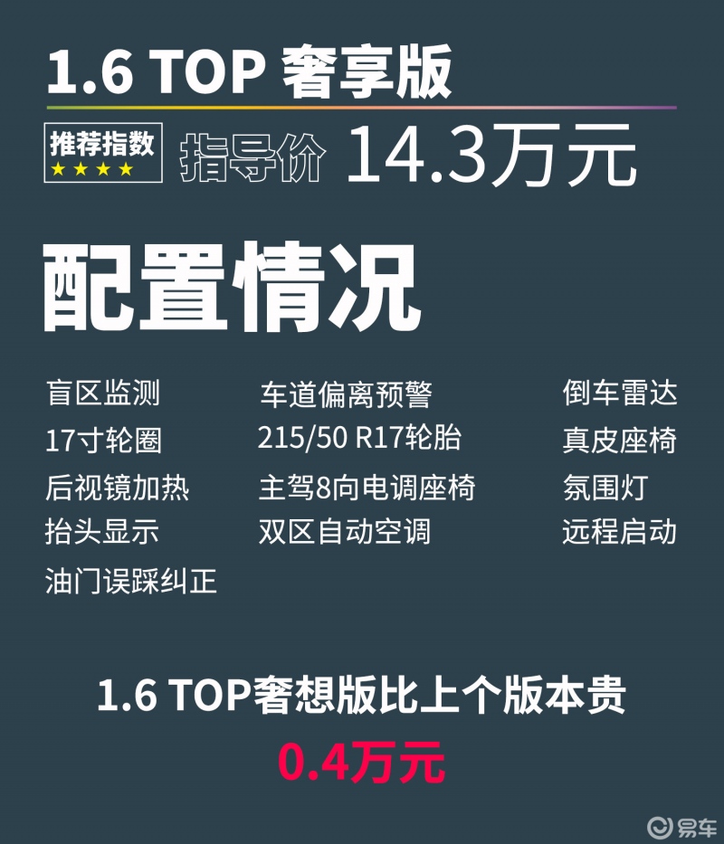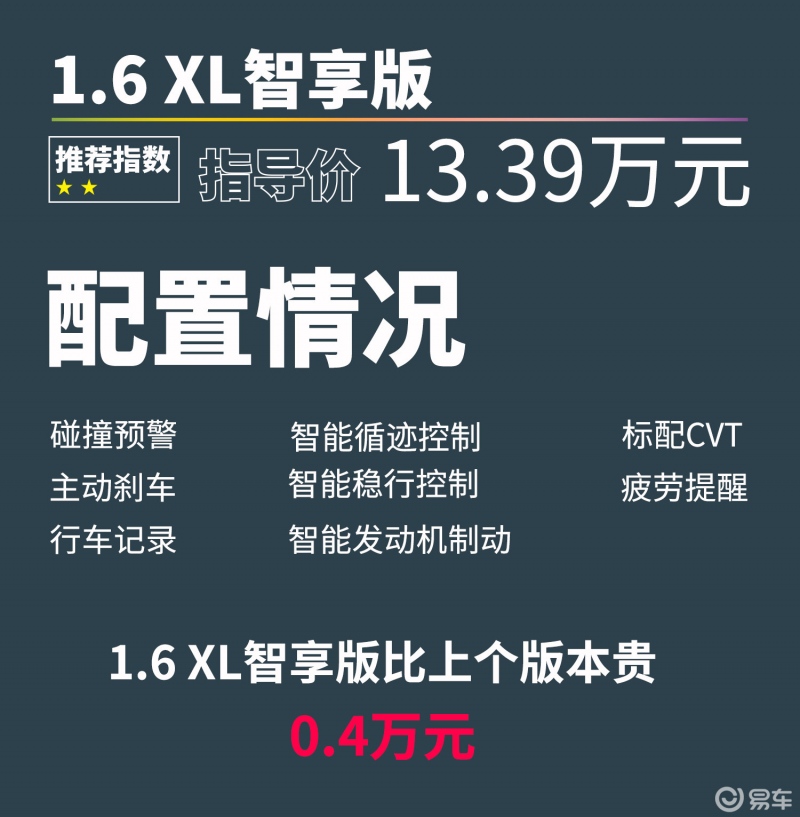 由于多出来的这些配置实用性不高,所以我认为家用的话不如去买1.6 XL悦享版CVT车型(便宜4000元),而1.6 XL智享版的推荐指数只能给到2星。