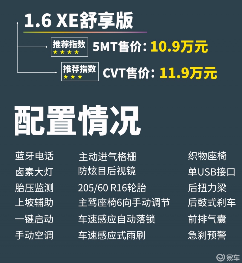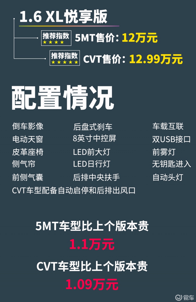 在新车发布了6款车型当中,我们推荐性价比相对较高,并且更适合家用的1.6 XL悦享版CVT车型。如果您偶尔拉个网约车,希望能让车辆“回本儿”,同时又不抵触手动挡,那入门的1.6L XE舒享版MT车型也是不错的选择。而对“真皮大沙发”有需求的同学,只能去选择顶配1.6L TOP 奢享版了。