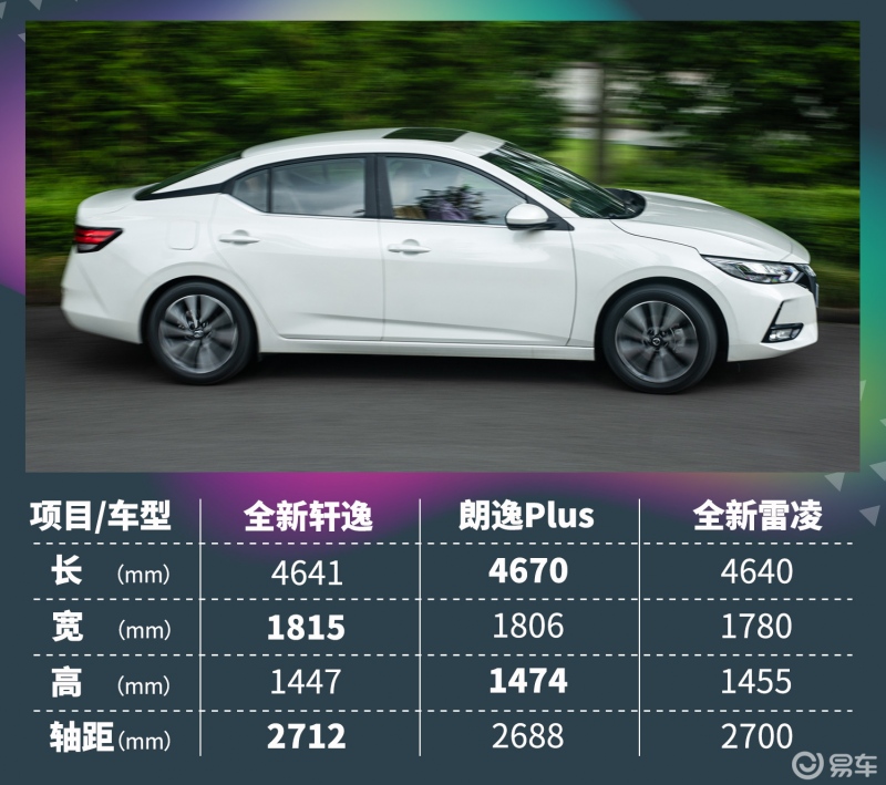 车身尺寸方面,全新轩逸的长宽高和轴距分别达到了4641/1815/1447/2712mm,使之成为朗逸Plus、全新雷凌等竞品当中最宽、轴距最长的选手。