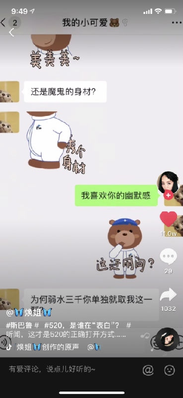 挑战赛作为抖音平台的官方传播渠道,其影响力以及各项权益自不必多言,但对于那些预算相对较少的品牌商来说,具有更高性价比的操作方式才是他们真正想要的解决办法。借用已经火起来的段子和话题进行产品或品牌内容植入,就顺理成章得进入了品牌商们的眼帘。譬如,下面这条疑似斯巴鲁品牌传播的“520萌萌哒小熊”短视频,就收获了“90W+播放、11W点赞”的不错数据。