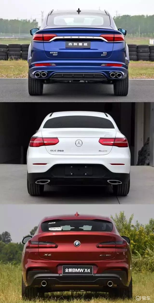 最后是背面,这一轮最亮眼的应该是X4了,简洁而极具运动气息,遮住下半部分,妥妥是一台轿跑的气质,特别是半熏黑的细长尾灯,格外出彩。GLC则是简约圆润的风格。星越的尾部稍显繁杂,但双边四出的设计还是很霸气。