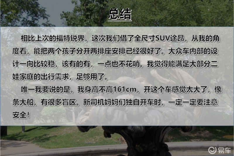 上次栏目组借了一辆七座SUV福特锐界给我,被我吐槽了,第三排没办法放安全座椅,也没法安排孩子坐。所以,这次老板安排了辆全尺寸SUV途昂给我,提车的时候我俩都感叹,这车真是太大了!