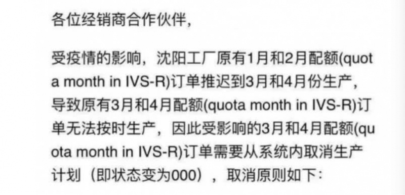 一份来自宝马经销商的文件显现,因为遭到疫情影响,华晨宝马工厂原有1月和2月的订单将推延至3月与4月,导致原有的配额订单或将无法准时出产。现在这些订单的状况变为“000”(撤销出产计划)不知道各位现已下单的小伙伴,有没有收到来自宝马官方的音讯?
