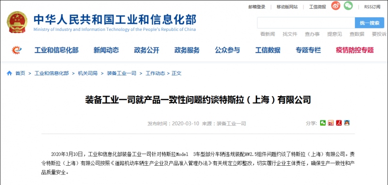 (观察者网 文/杨帆 修改/徐喆)据工业和信息化部网站音讯,2020年3月10日,工业和信息化部配备工业一司针对特斯拉Model 3车型部分车辆违规装置HW2.5组件问题约谈了特斯拉(上海)有限公司。责令特斯拉(上海)有限公司依照《路途机动车辆出产企业及产品准入管理办法》有关法律法规当即整改,实在实行企业主体职责,保证出产一致性和产品质量安全。