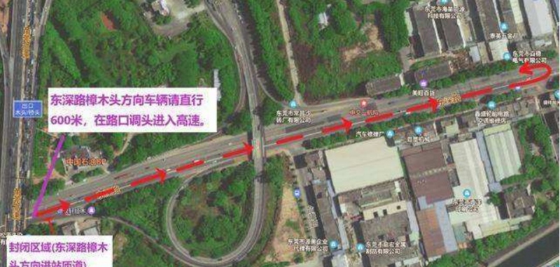 2、2020年4月23日出站后往东深路樟木头方向匝道全关闭施工,5月12日免除交通管制。需往樟木头方向车辆请右转往桥头方向直行约800米,在红路灯路口调头前往樟木头方向