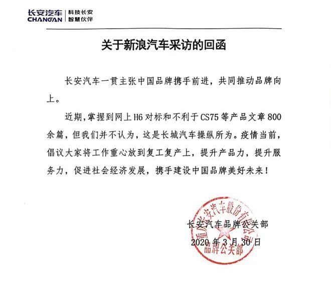 而涉事的另一方长安轿车则向媒体表明,“近期把握到网上H6对标和不利于CS75等产品文章800余篇,但咱们并不以为这是长城轿车操作所为。”