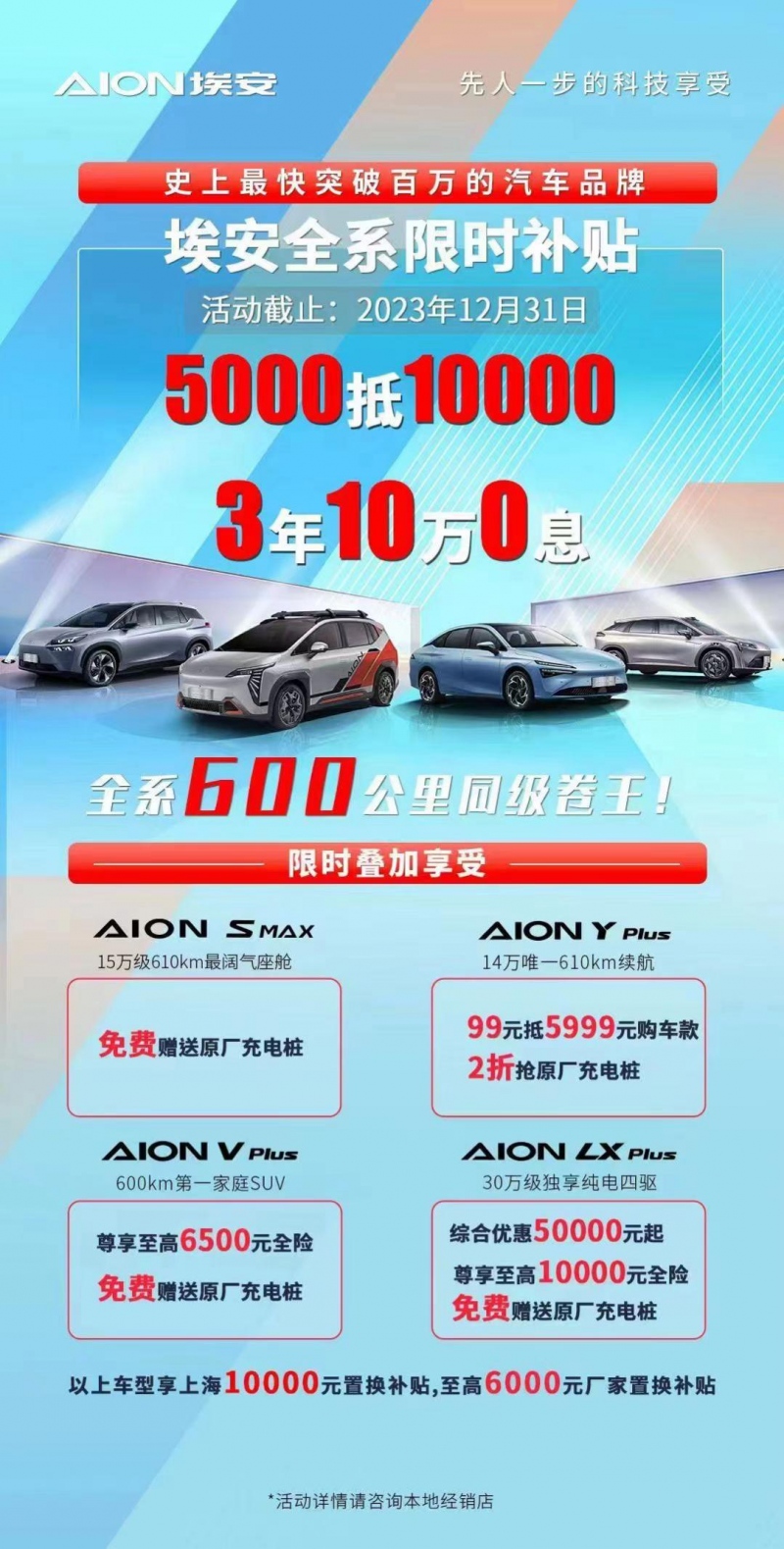 随着科技的不断演进,汽车产业也在不断焕发出新的活力。在这个竞争激烈的新能源汽车市场上,广汽埃安一直致力于“EV(纯电动)+ICV(智能网联)”的创新引领。旗下车型以其独特的设计、领先的技术以及出色的性能,无不彰显出埃安品牌的卓越之处。而如今,在上海广汽埃安松卫体验中心,埃安推出了全系限时5000抵10000、3年10万免息的优惠活动,让消费者更加轻松地享受未来科技带来的智能出行体验。